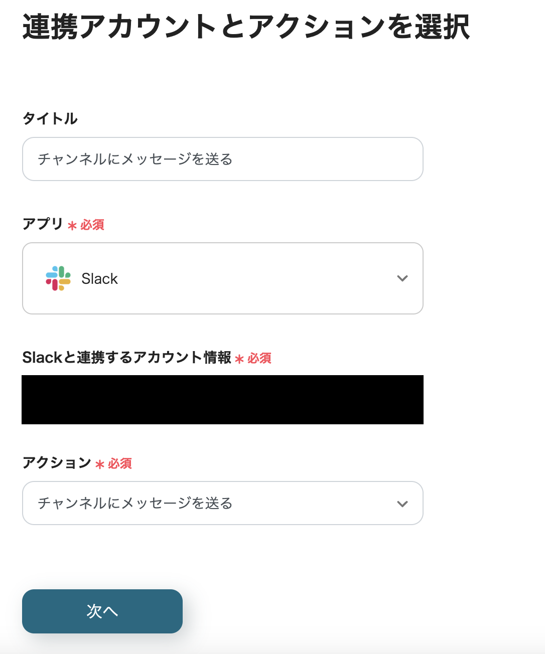 連携アカウントとアクションを選択の画面は、連携アカウントやアクションを確認して「次へ」をクリックしましょう。