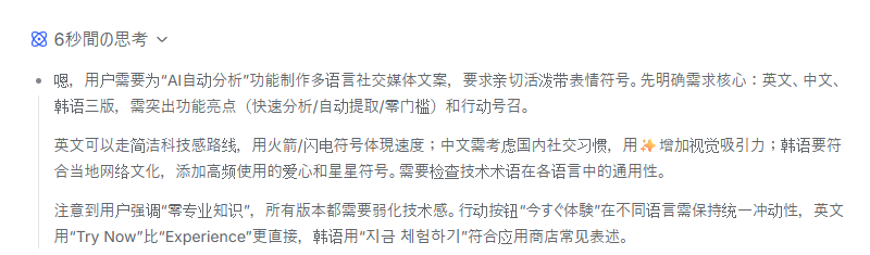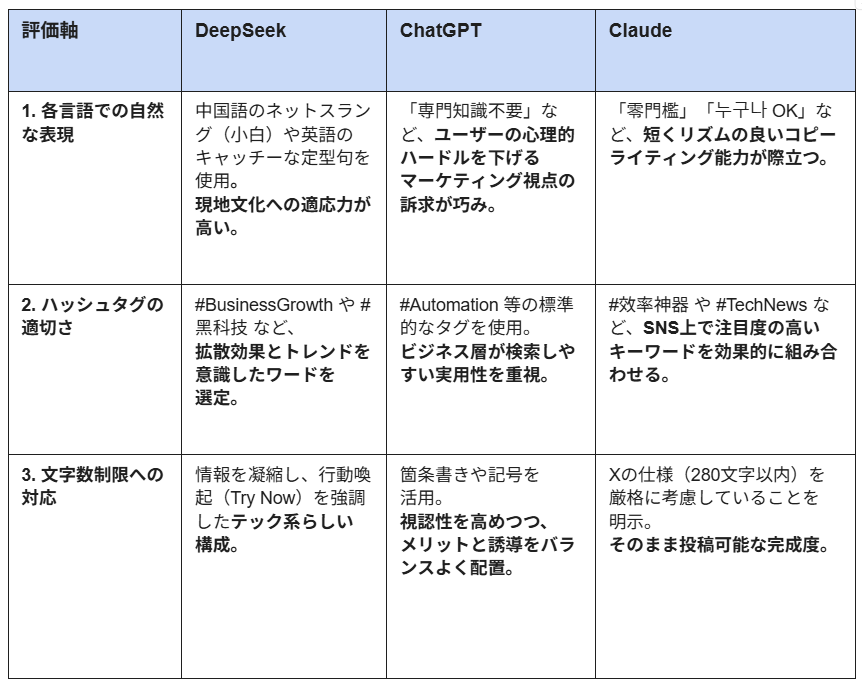 DeepSeekは、多言語でのSNSプロモーション文作成において、単なる翻訳の枠を超えた高いローカライズ精度を発揮しました。たとえば、英語のキャッチーな言い回しや中国語での「小白(初心者)」といった現地特有のニュアンスを巧みに取り入れており、多言語展開のリードタイムを劇的に短縮しつつ、各文化圏への訴求力を高められるツールだと感じました。