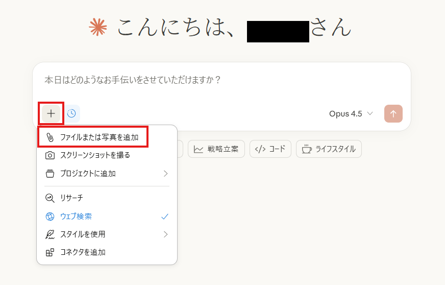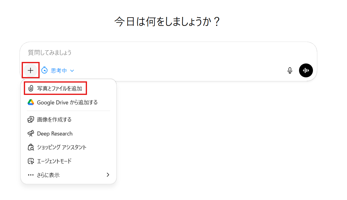「+」マークをクリックし、「ファイルまたは写真を追加」を選択してPDFを読み込ませ、プロンプトを入力したら送信します。