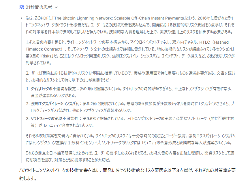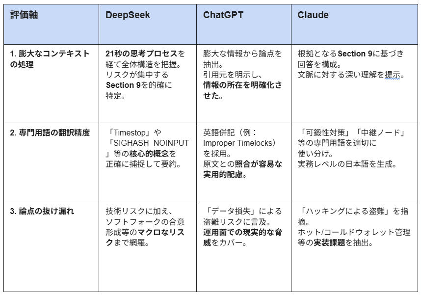 DeepSeekは、専門用語が頻出する長文の技術仕様書を深く読み込み、開発リスクを抽出する際に高い精度で対応しました。 出力結果は技術的な核心を突いた高度な内容であり、「Timestop」や「SIGHASH_NOINPUT」といった具体的な対策案まで明示されており、技術レビューの工数削減と迅速な意思決定に大きく貢献できるツールだと感じました。