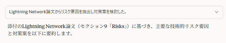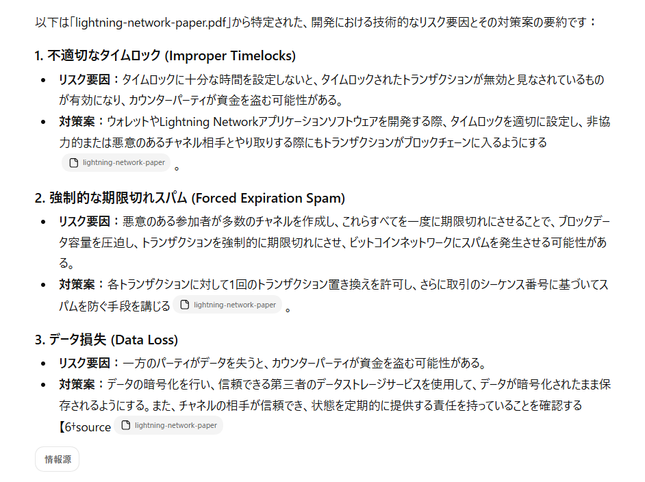 他ツールと同様に、膨大な情報の中から該当する論点を抽出し、各回答に引用元のソース(lightning-network-paper)を明示することで、情報の所在を明確に示しました。