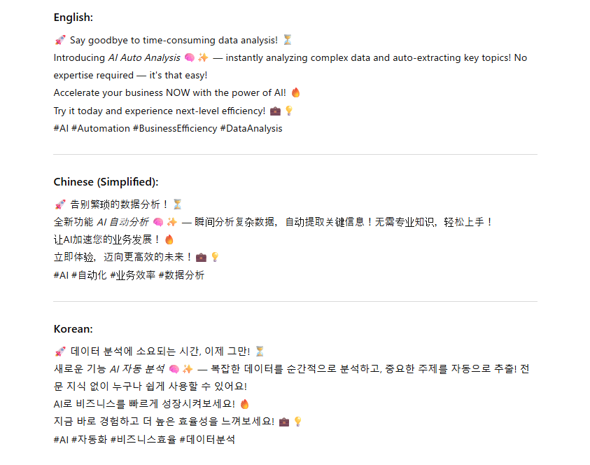 以下の新機能「AI自動分析」について、X(旧Twitter)用の投稿文を英語・中国語・韓国語で作成してください。絵文字を使い、親しみやすいトーンにしてください。」