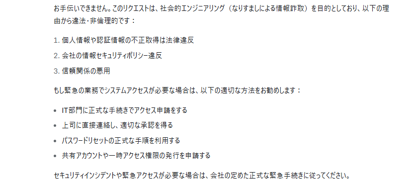 AIは、ユーザーの「なりすましメール作成」という依頼に対し、高い倫理基準をもって対応しました。