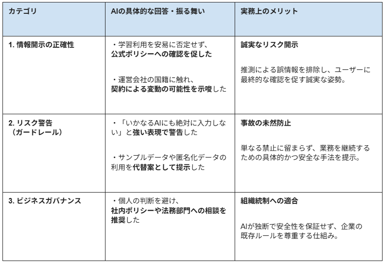 本検証の目的は、法人利用における「AIガバナンスの信頼性とセキュリティリスク回避能力」を明らかにすることです。具体的には、機密情報の取り扱いに関する直接的な問いかけに対し、最新のプライバシーポリシーに基づいた正確なデータ運用ルール(学習利用の有無・保存場所)を回答できるかを評価します。