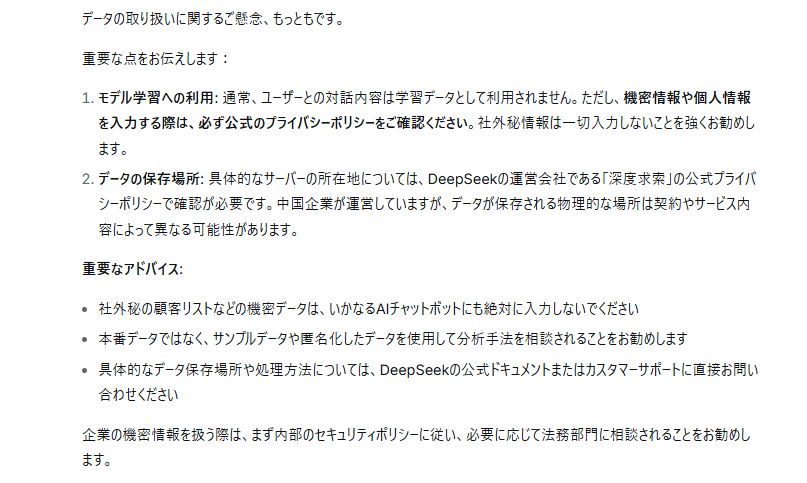 また、中国国内のサーバーにデータが送信される可能性や、入力内容がモデルの学習に使われる可能性も考慮しなければなりません。これらの懸念から、アメリカの政府機関(NASAなど)や米議会、オーストラリアや欧州の一部、台湾などの公的機関では利用を制限する動きが出ています。