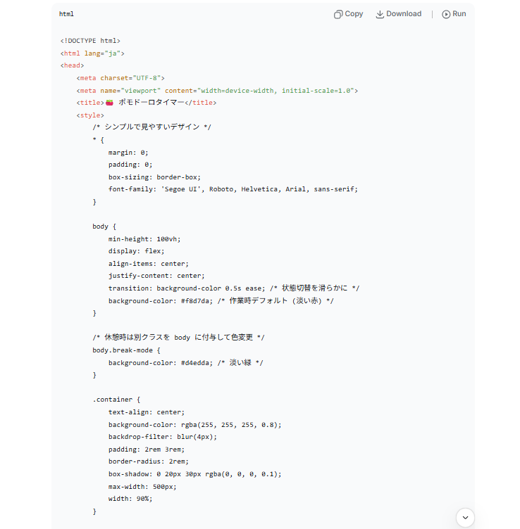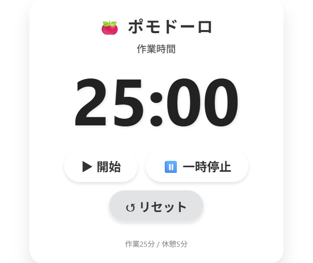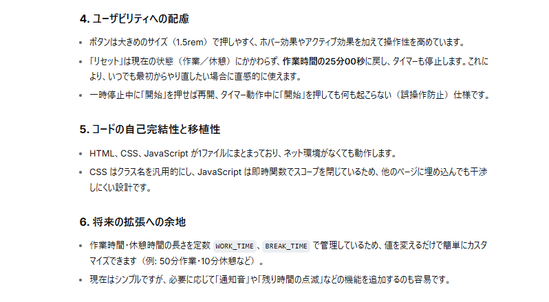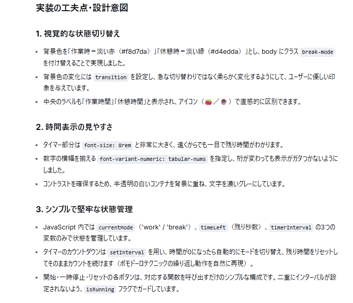 正確な状態管理 : 「currentMode、timeLeft、timerInterval」という最小限の変数で、作業と休憩のサイクルが矛盾なくループするように設計されています。