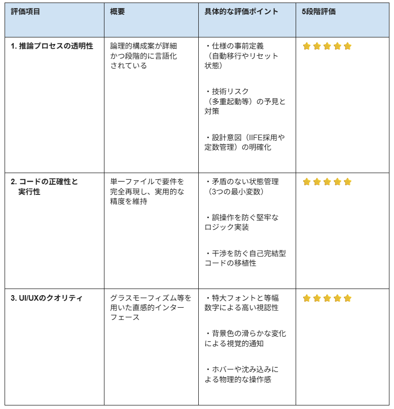検証目的 本検証の主な目的は、LLMにおける「複雑な指示の解釈能力」と「フロントエンド実装におけるエンジニアリング・デザインの統合能力」を評価することにあります。 具体的には、設計意図の言語化を通じてAIが実装の優先順位をいかに定義しているかという推論プロセスの質を確認し、外部ライブラリに頼らない単一ファイル内での動的なタイマー制御の正確性を技術的に検証した上で、抽象的なUI/UX指示に対して配色やタイポグラフィ等の細部まで配慮した直感的で洗練されたインターフェースをどこまで提案できるかを明らかにすることを目指します。