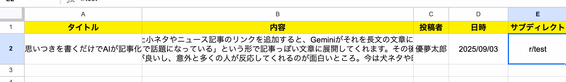 Google スプレッドシートに投稿の元となるキーワードやアイデアを追加するだけで、DeepSeekが自動で投稿テキストを生成し、指定したRedditのサブレディットに投稿します。