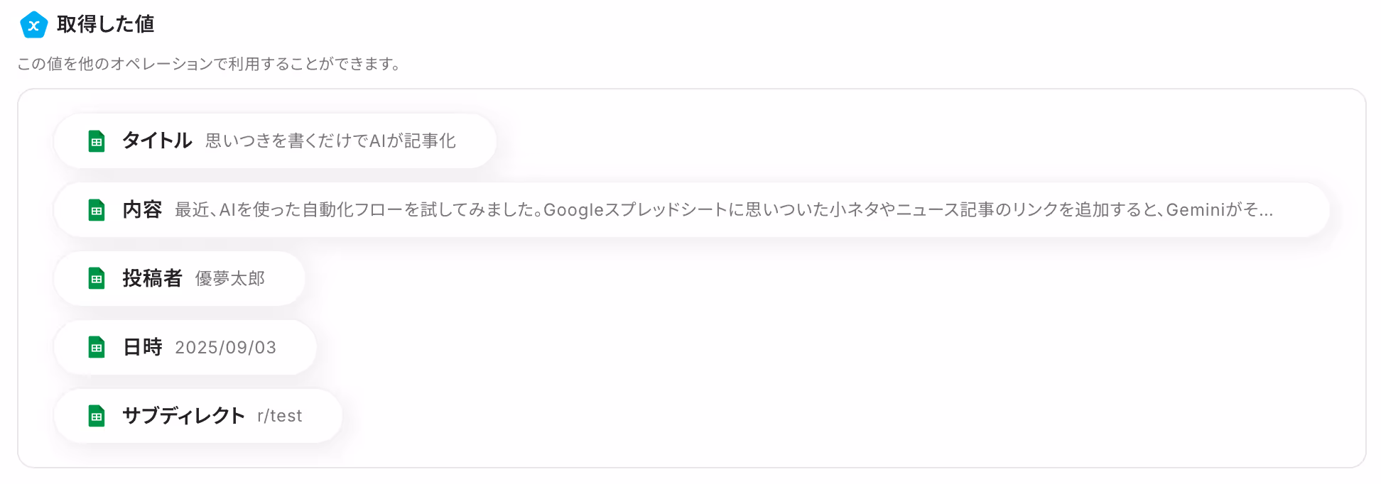 テストが成功すると取得した値に、先ほどGoogle スプレッドシートに追加した内容が表示されます。