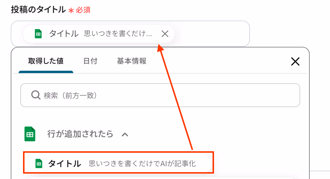 取得した値とは、トリガーやオペレーション設定時に、「テスト」を実行して取得したデータのことを指します。