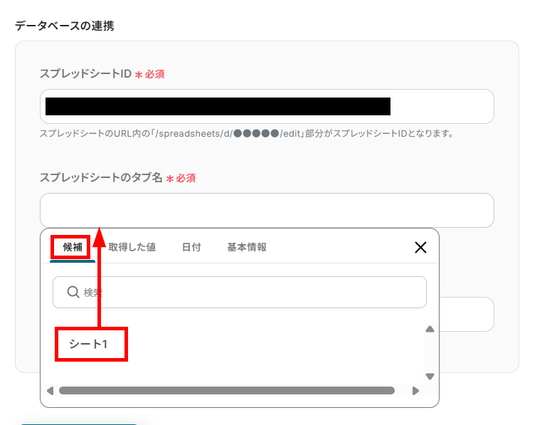 - スプレッドシートIDとスプレッドシートのタブ名は、候補から設定できます。