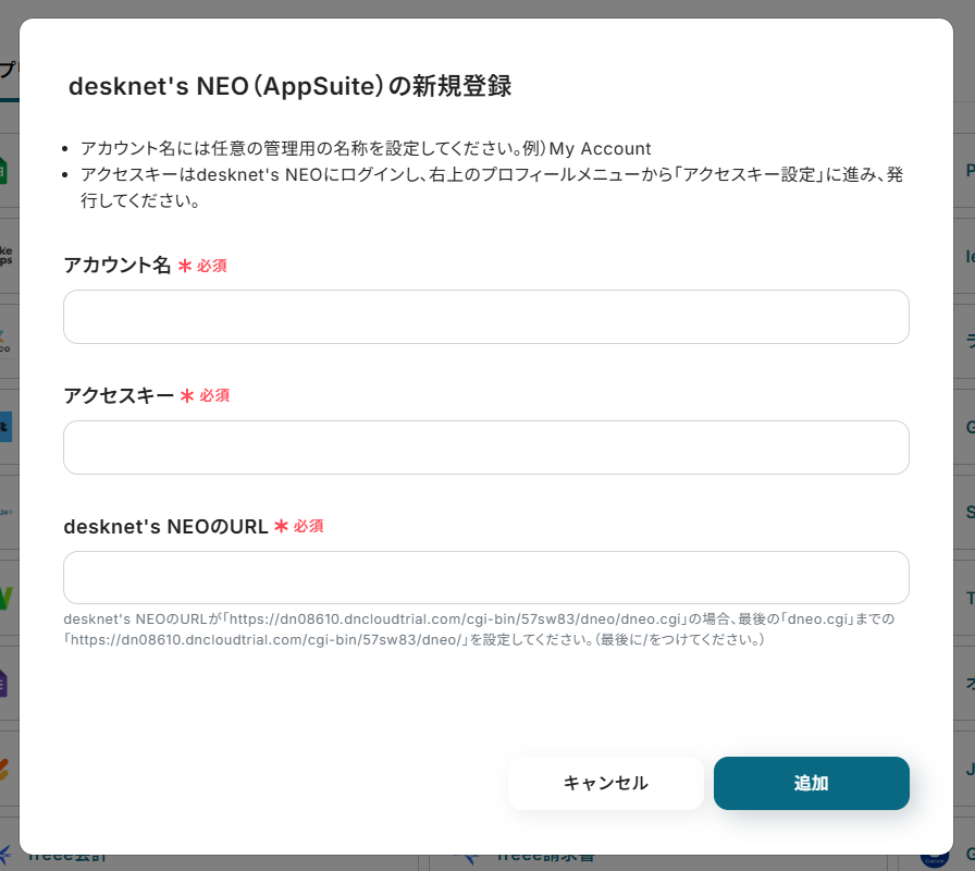 以下画面の注記を参考にして、アカウント名・アクセスキー・desknet’s NEOのURLを入力し、「追加」をクリックすると連携完了です。