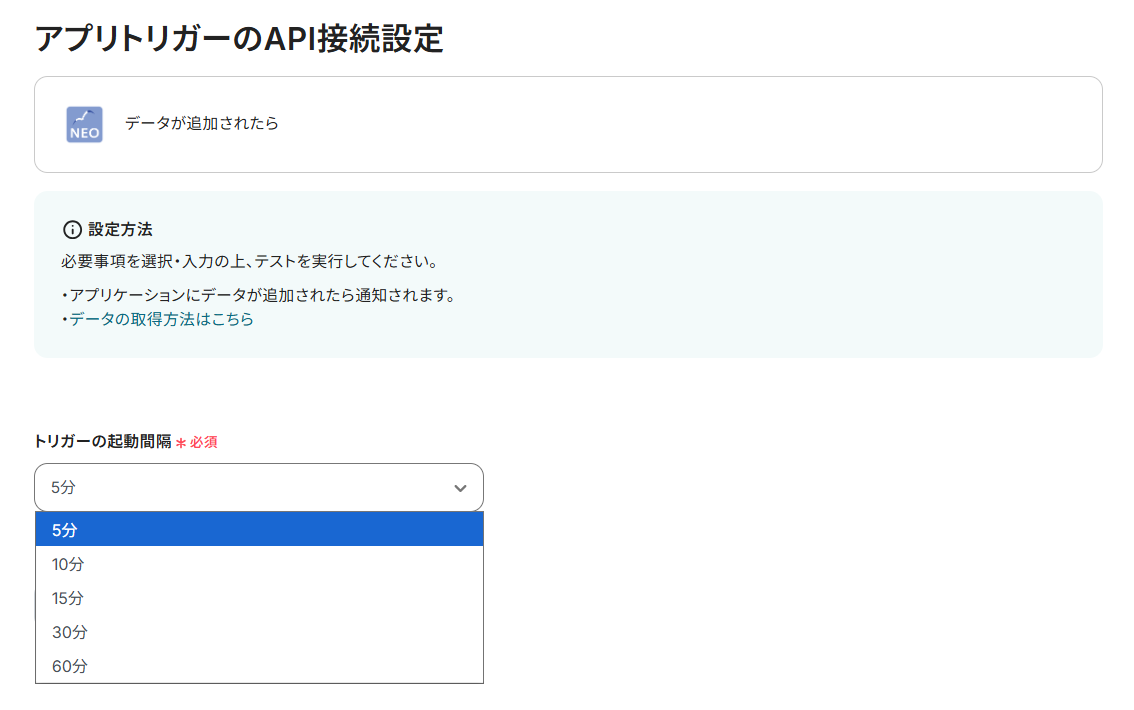 トリガーの起動タイミングは、5分、10分、15分、30分、60分のいずれかを設定できます。