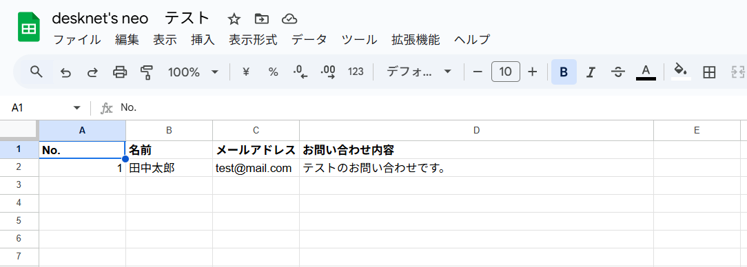 テストが成功したら、Google スプレッドシートにデータが追加されていることを確認します。