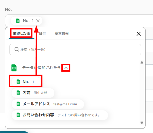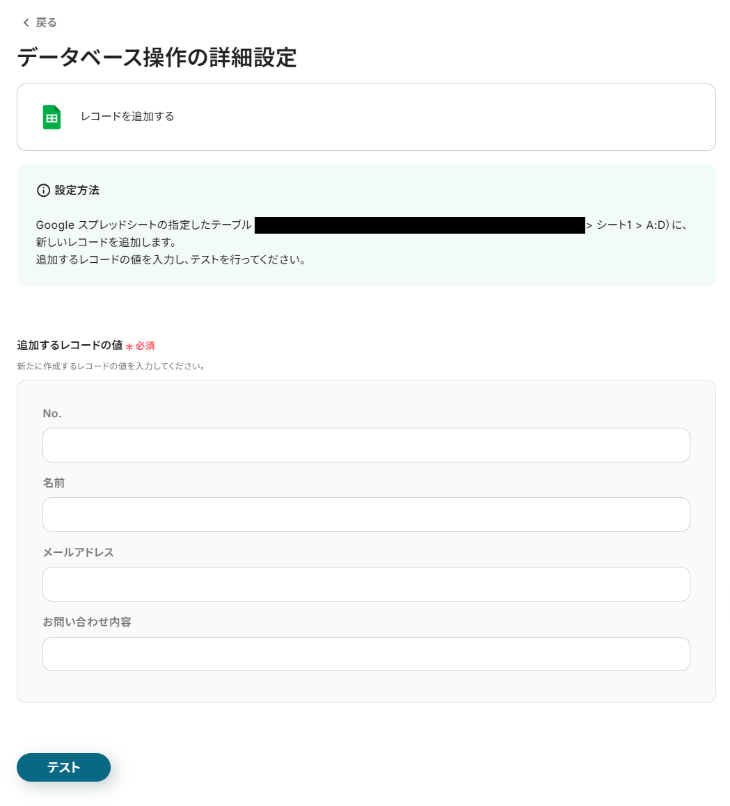 追加するレコードの値に、指定したGoogle スプレッドシートの項目が表示されます。