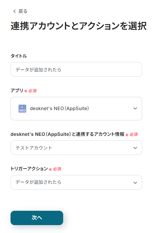 - desknet's NEO(AppSuite)と連携するアカウント情報には、Yoomと連携したアカウントが表示されます。