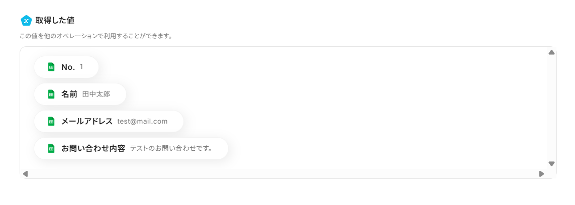 ステップ3で取得した値の事例としてご紹介した、Google スプレッドシートでテストを行った場合の表示になります。