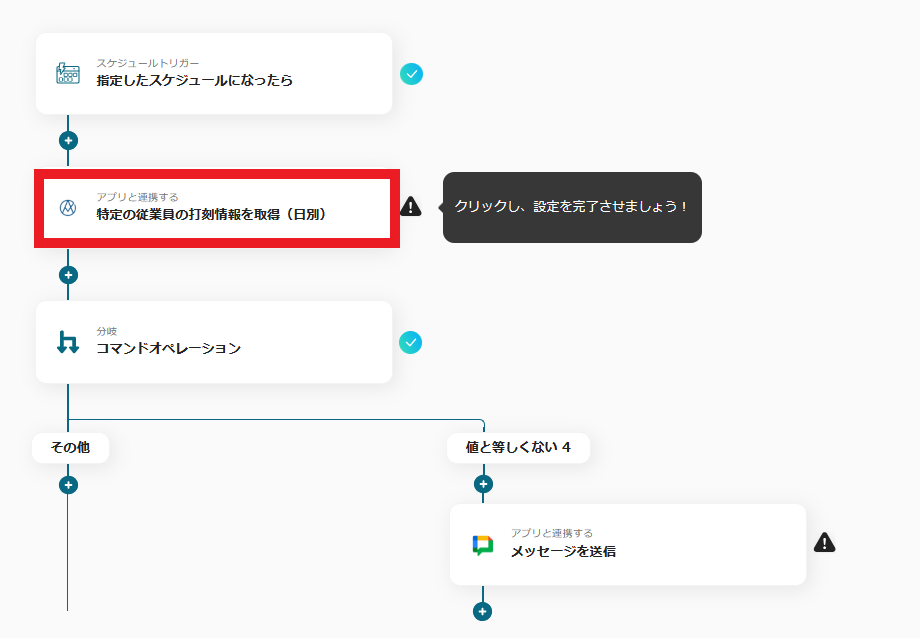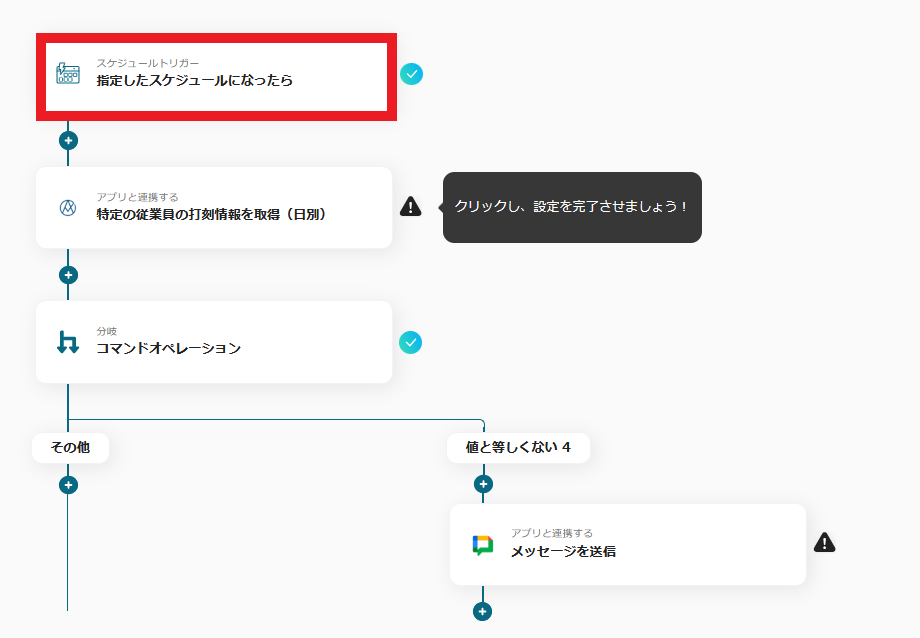 4.これで、【AKASHIで前日の打刻漏れを検知してGoogle Chatに通知する】というフローが完成しました。