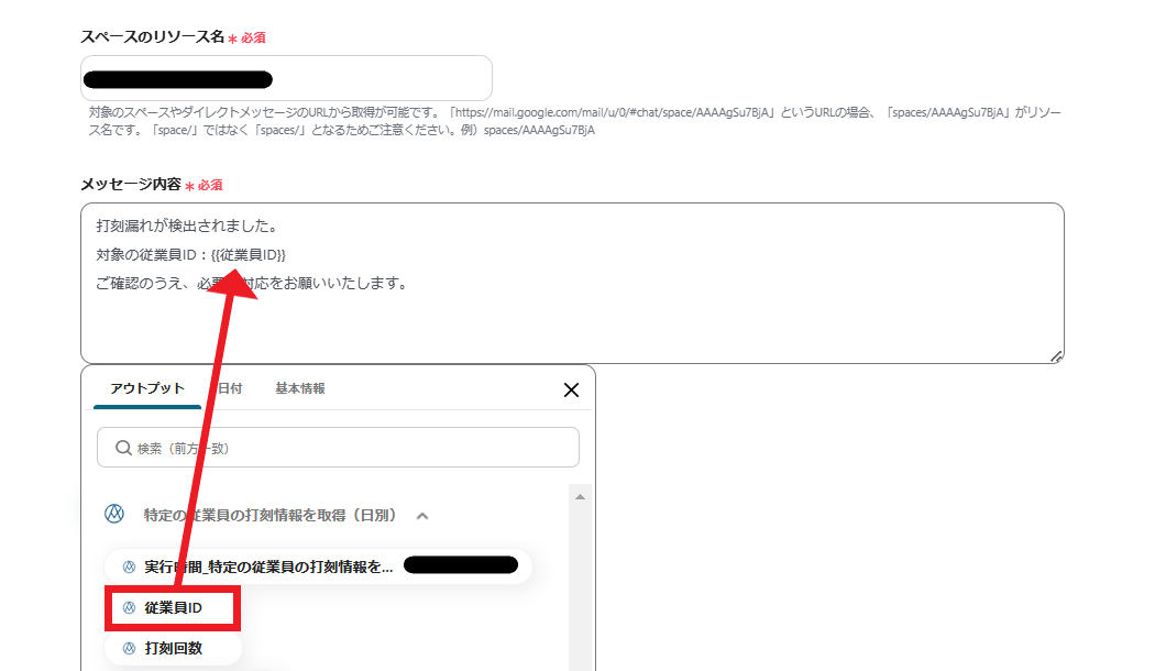 3.スペースのリソース名、メッセージ内容を設定していきます。