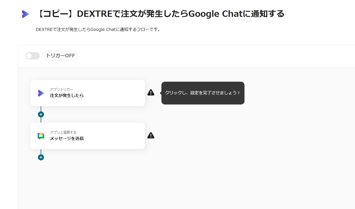 これで【DEXTREで注文が発生したらGoogle Chatに通知する】というフローが完成です。
