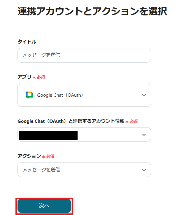 2) アクションは「メッセージを送信」を選択し、「次へ」をクリックします。