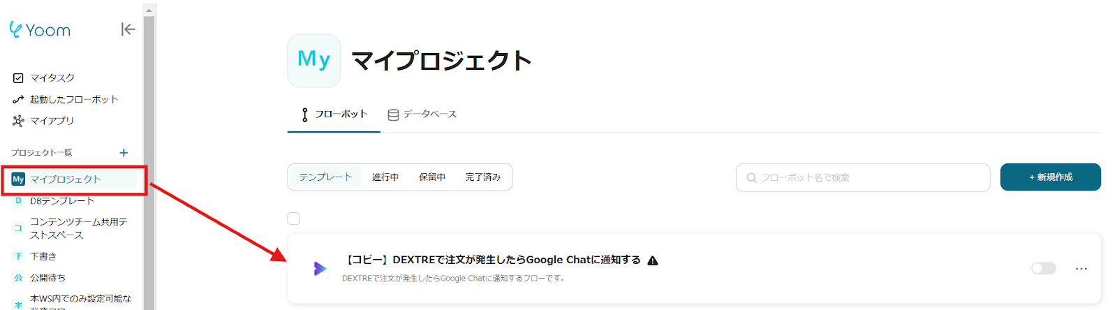 ここからは、Yoomのテンプレート【DEXTREで注文が発生したらGoogle Chatに通知する】という連携フローを使って設定をしていきます。