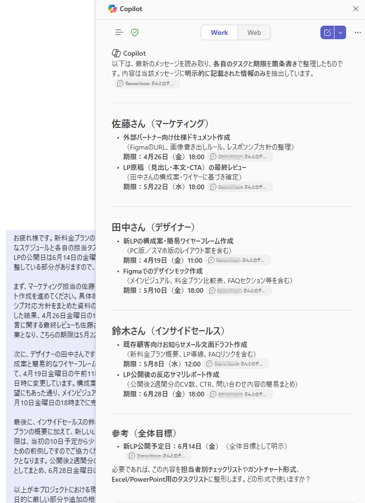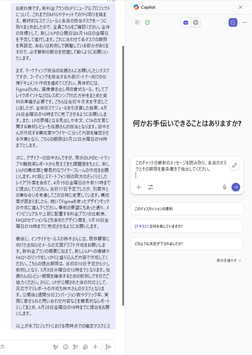 検証2:Teamsのチャット履歴を要約してタスクを抽出する手順 次に、Teamsで送信されたタスク依頼に関する長文のメッセージから、各担当者ごとのタスクを抽出してみました。
