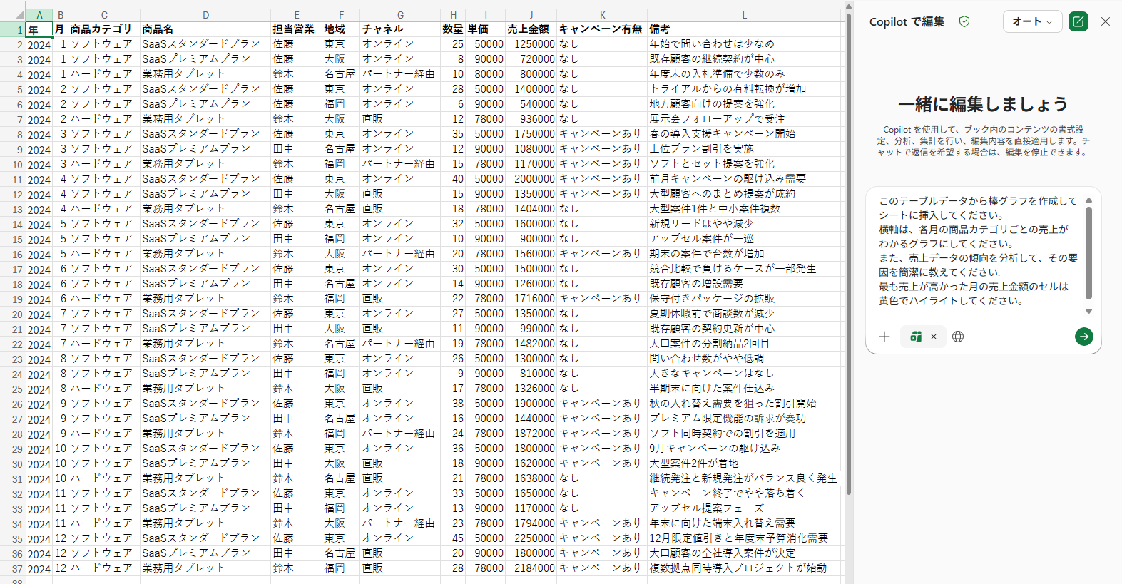 ExcelでのCopilot活用は、表計算ソフトの専門スキルがない方にとって非常に強力なサポートとなります。普段使っている自然な言葉で指示を出すだけで、複雑な関数を組むことなく、必要なグラフの作成やデータ分析を瞬時に実行してくれます。 既存のテーブルデータを自動で整えてくれるため、元のデータを加工する手間も省け、業務の幅が大きく広がります。 ただし、AIによる処理が常に完璧であるとは限りません。 今回の検証でも、初回の指示では全体の売上がグラフに上手く反映されない事象が発生しました。 しかし、Copilotに対して修正内容を具体的に伝えたところ、すぐに正確なグラフへと修正されました。 このように、指示の解釈漏れなどが発生する可能性もあるため、生成されたデータやグラフの内容が正しいかどうか、最終的な目視でのチェックは必須と言えます。
