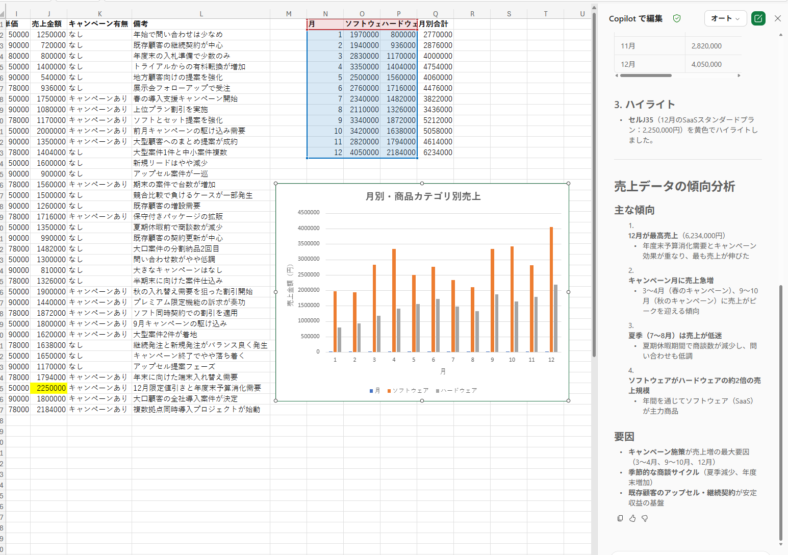 このテーブルデータから棒グラフを作成してシートに挿入してください。 横軸は、各月の商品カテゴリごとの売上がわかるグラフにしてください。 また、売上データの傾向を分析して、その要因を簡潔に教えてください。 最も売上が高かった月の売上金額のセルは黄色でハイライトしてください。