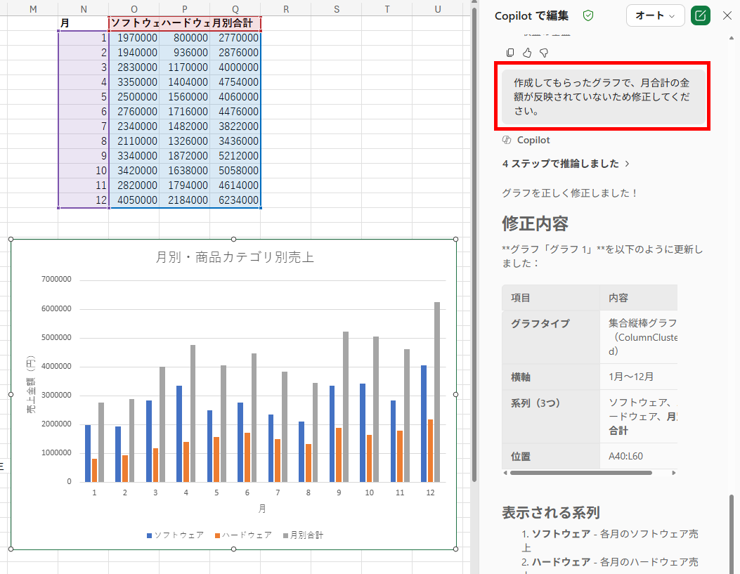 今回は、一度目の指示で毎月の売上合計が反映されていなかったので、修正するように指示をして、正確なグラフを作成してもらいました。