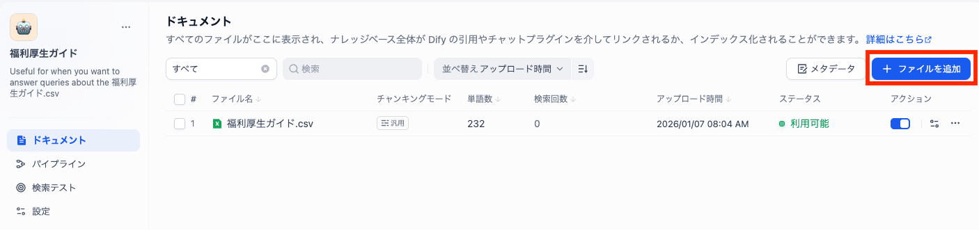 今回作成したナレッジを選び、「ファイルを追加」をクリックして、ファイルをアップロードします。