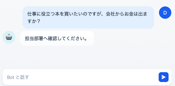 最初は「本を買う時にお金は出ますか?」という質問に対し、マニュアルに記載があるにもかかわらず「担当部署へ確認してください」という回答になりました。
