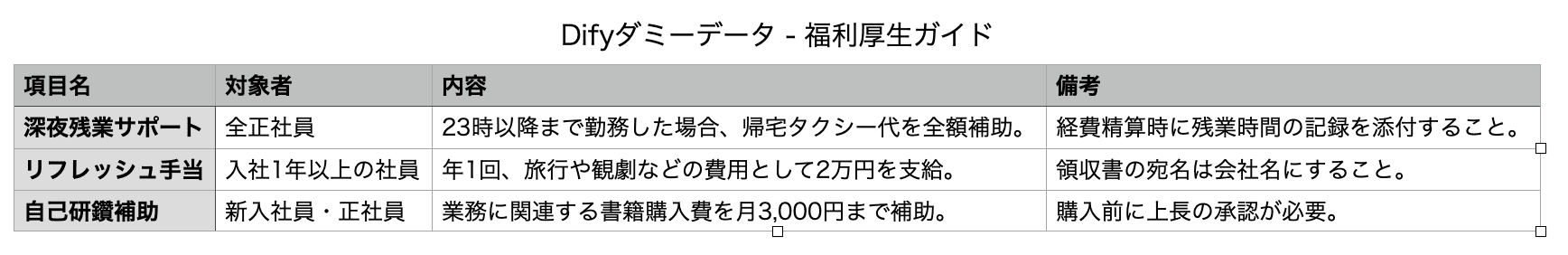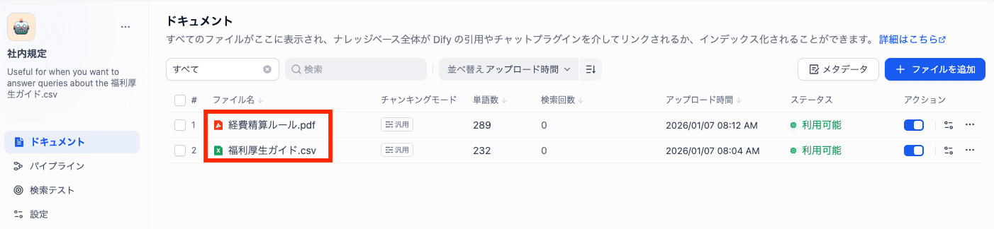今回は、以下の経費精算ルール.pdfと福利厚生ガイド.csvを用意しました。