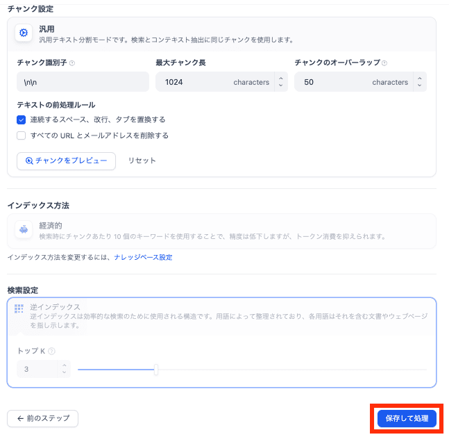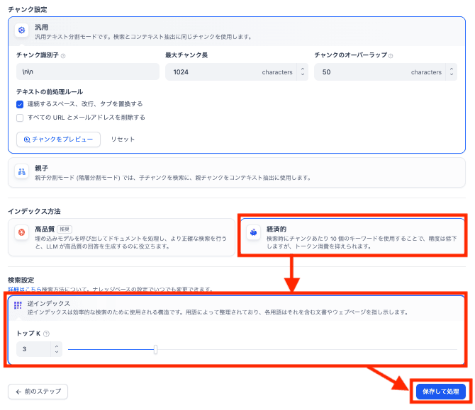チャンク設定は変更せず、インデックス方法と検索設定を以下のように設定します。