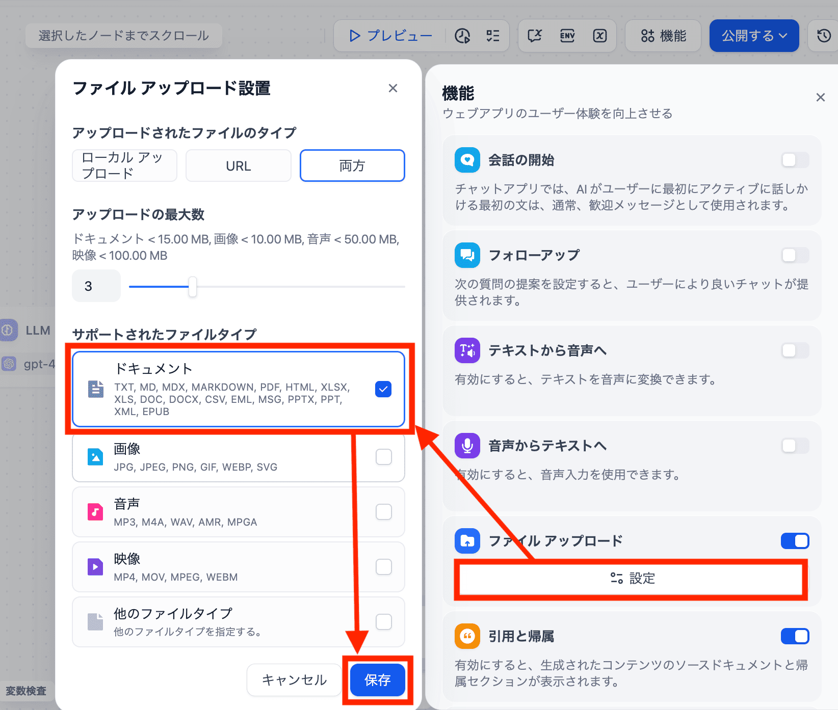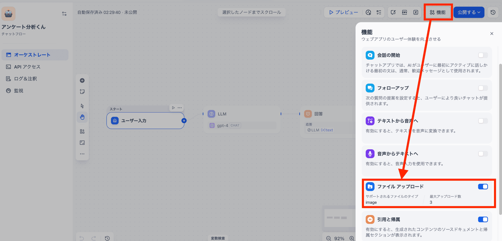 チャットフロー編集画面の右上にある「機能」をクリックし、ファイルアップロード機能をオンにします。