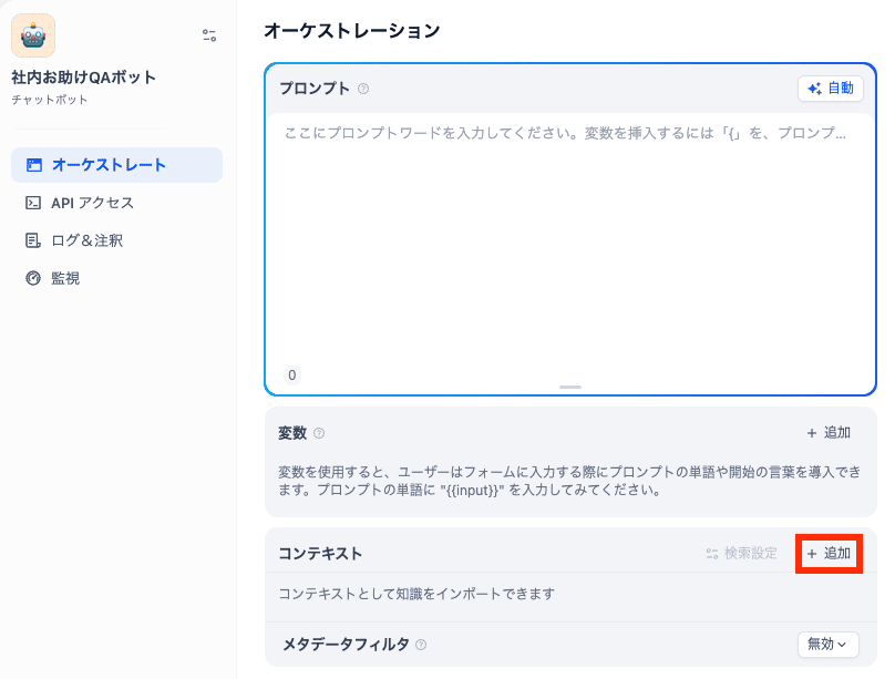 3.編集画面の左側にある「コンテキスト」の「+追加」をクリックし、ステップ1で作ったナレッジを選択