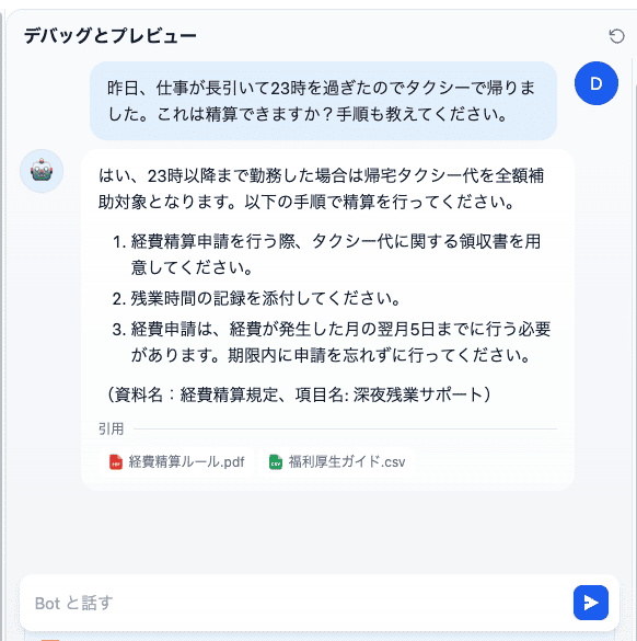 プレビュー画面を開き、質問を投げかけるとチャットボットが返答してくれます!