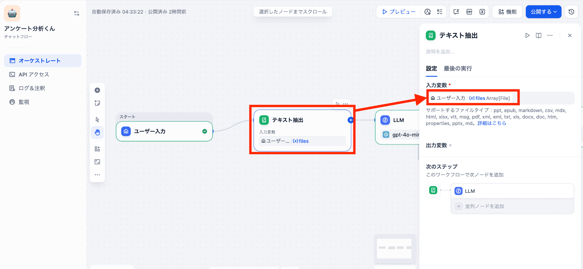 最終的には、LLMノードの前に「ドキュメント抽出ノード」を追加することで解決しました。このようなデータの受け渡しルールを知らないと、初心者の方は少し戸惑うかもしれません。
