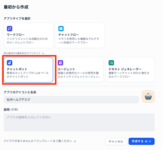 2.「チャットボット」を選び、名前(例:社内ヘルプデスク)を付けて作成