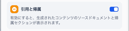 もし、引用元が表示されない場合は、「機能」から設定できます。機能の「引用と帰属」をオンにすることで、引用元が表示されます。