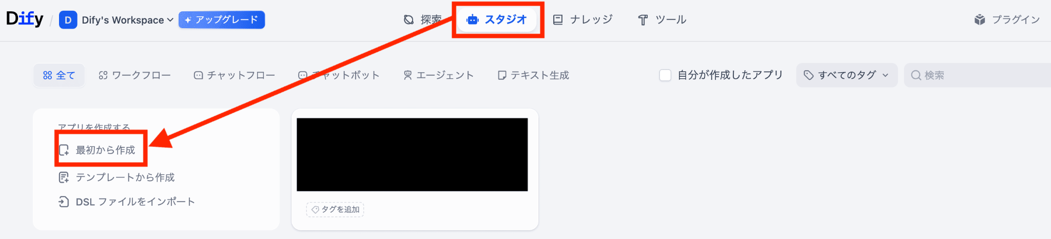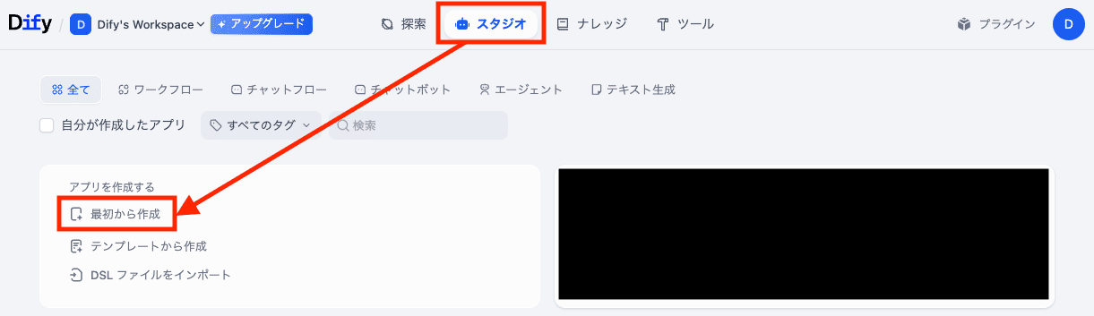 1.上部メニューの「スタジオ」→「最初から作成」をクリック