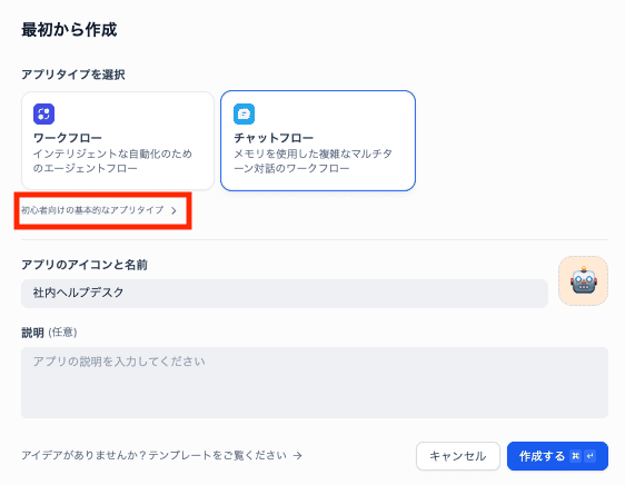 「初心者向けの基本的なアプリタイプ」を開くと、チャットボットが選択できます。