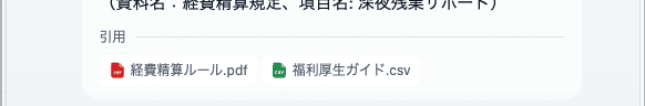 たくさんのファイルを読み込んでいても、必要に応じてすぐに一次情報(元の資料)を確認できます。「資料にこう書いてあるから大丈夫」と根拠を確かめられるのは、業務で使ううえで心強いポイントです。