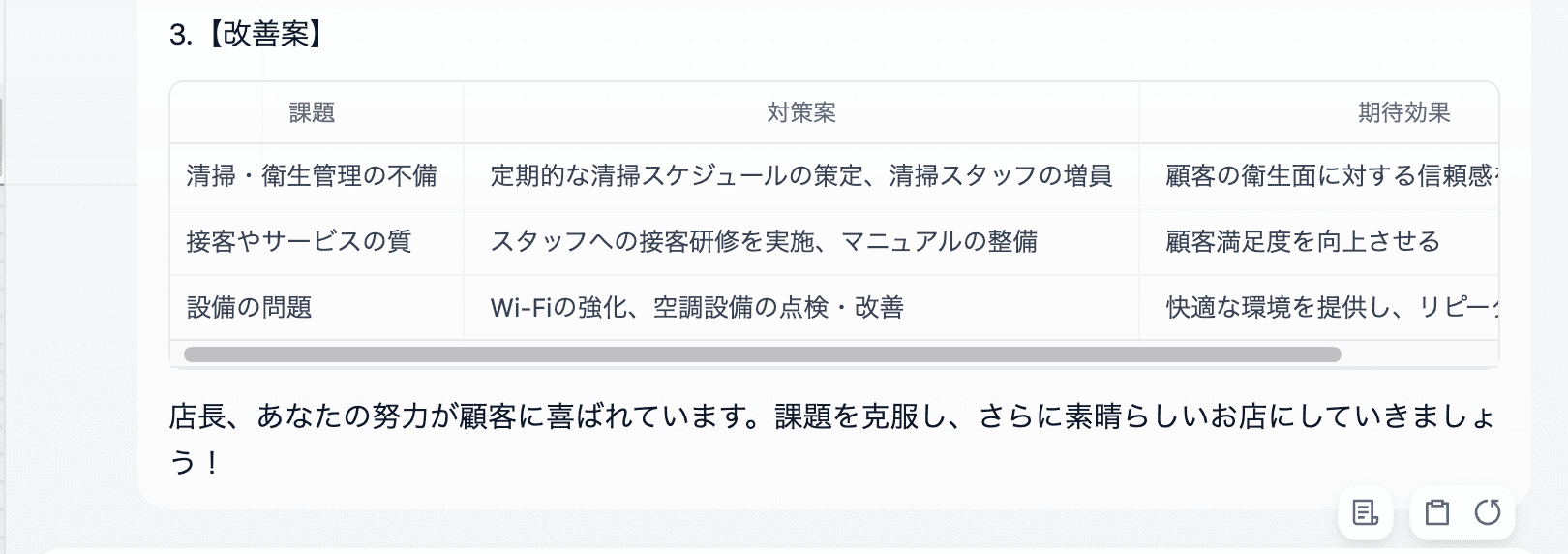 回答の最後には、店長を励ます一言を添えてください。