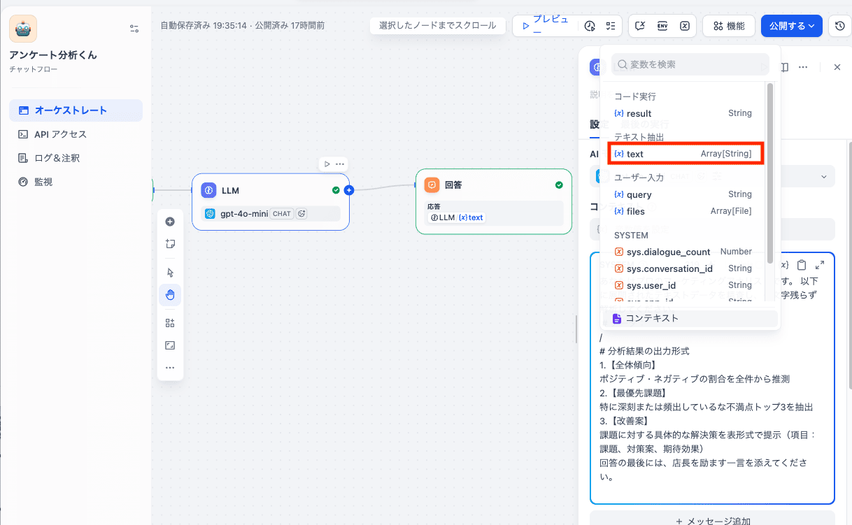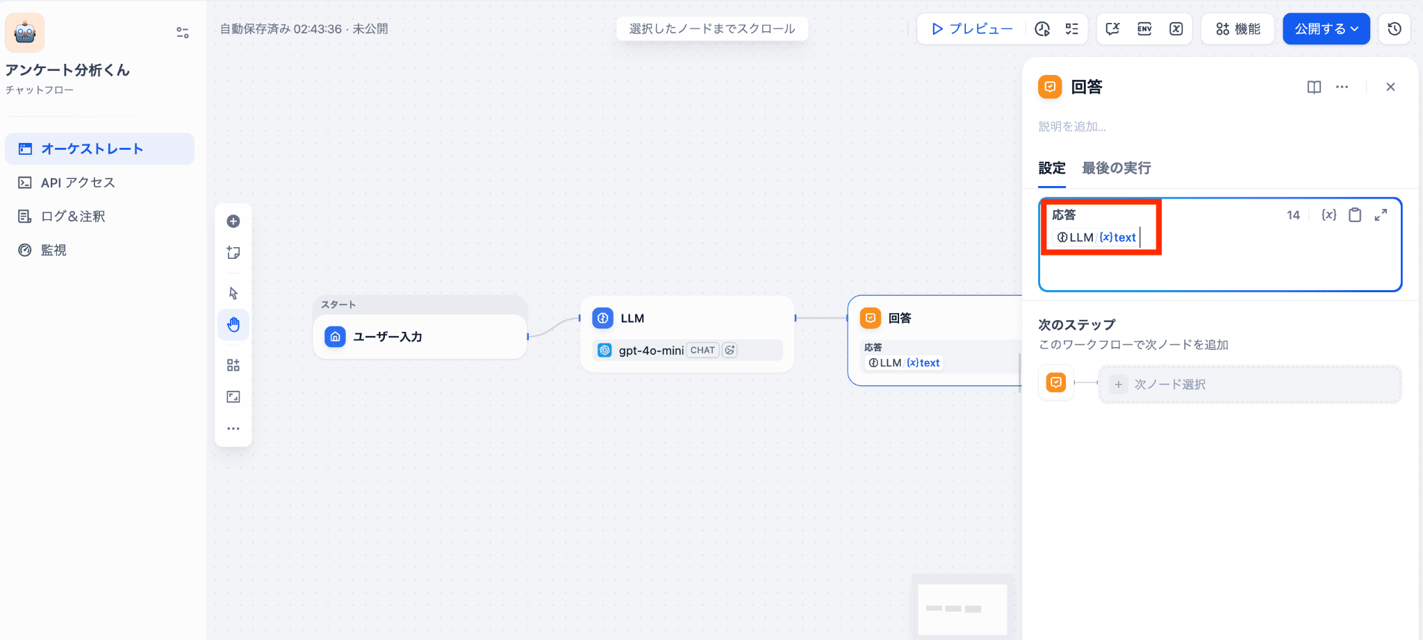 回答ノードの応答欄に、LLMノードから取得したテキストの変数を設定します。