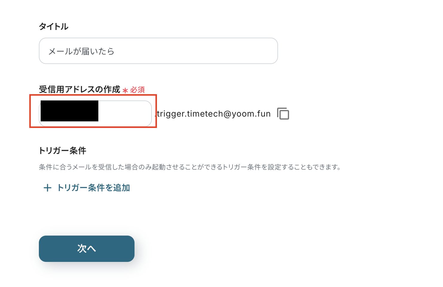 受信用のメールアドレスを設定し、次へをクリックしてください。