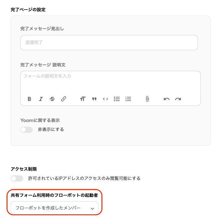 「共有フォーム利用時のフローボットの起動者」は、フローボットがフォーム送信時に起動するのか、管理者権限で起動するのか設定できます。