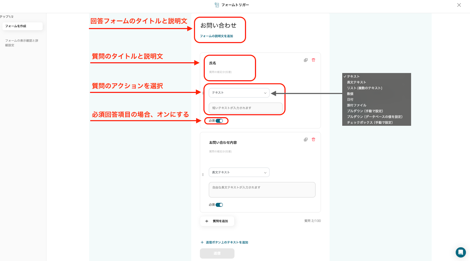「query」は、欄をクリックし、表示された候補から「お問い合わせ内容」を選択してください。