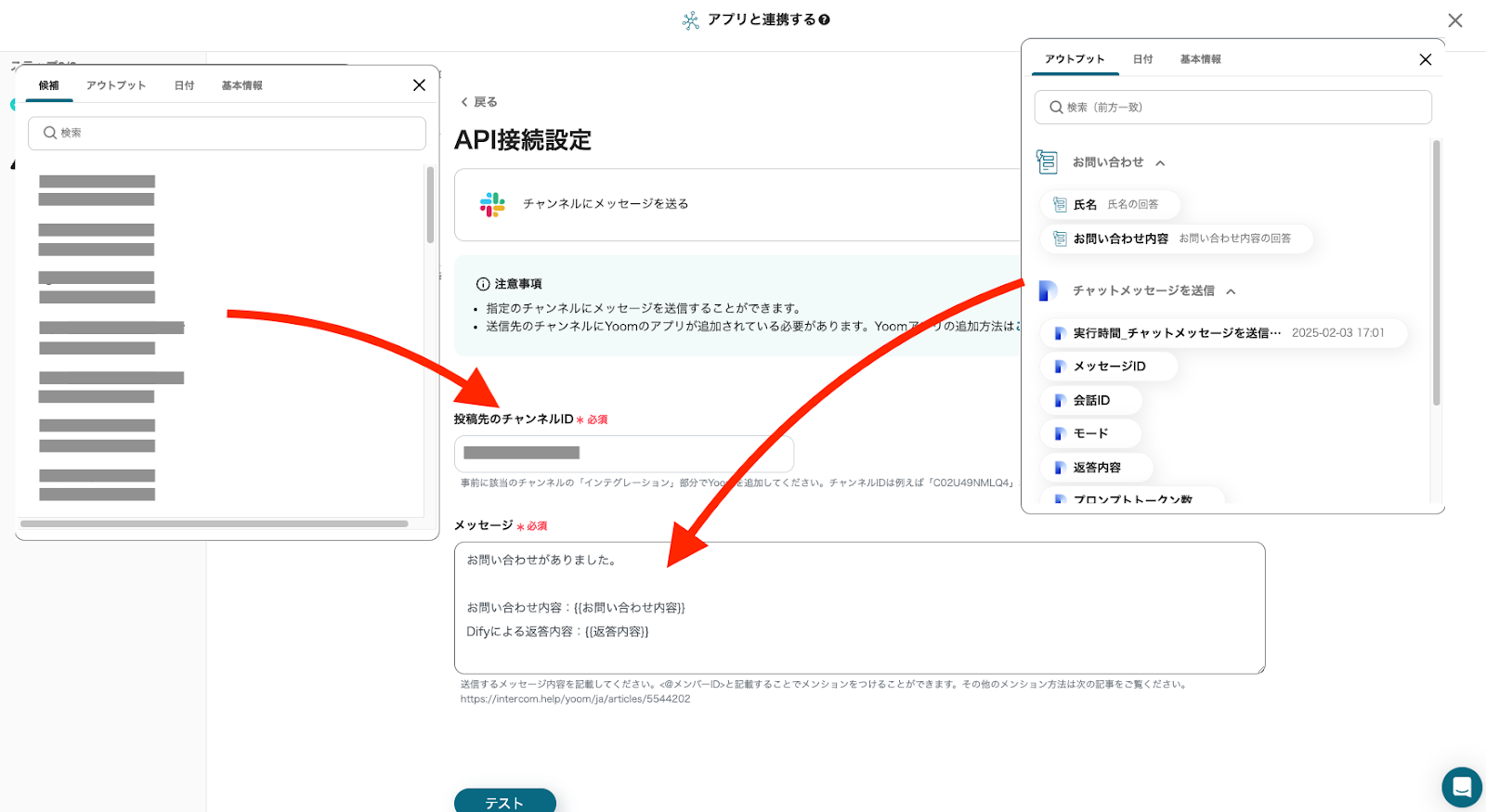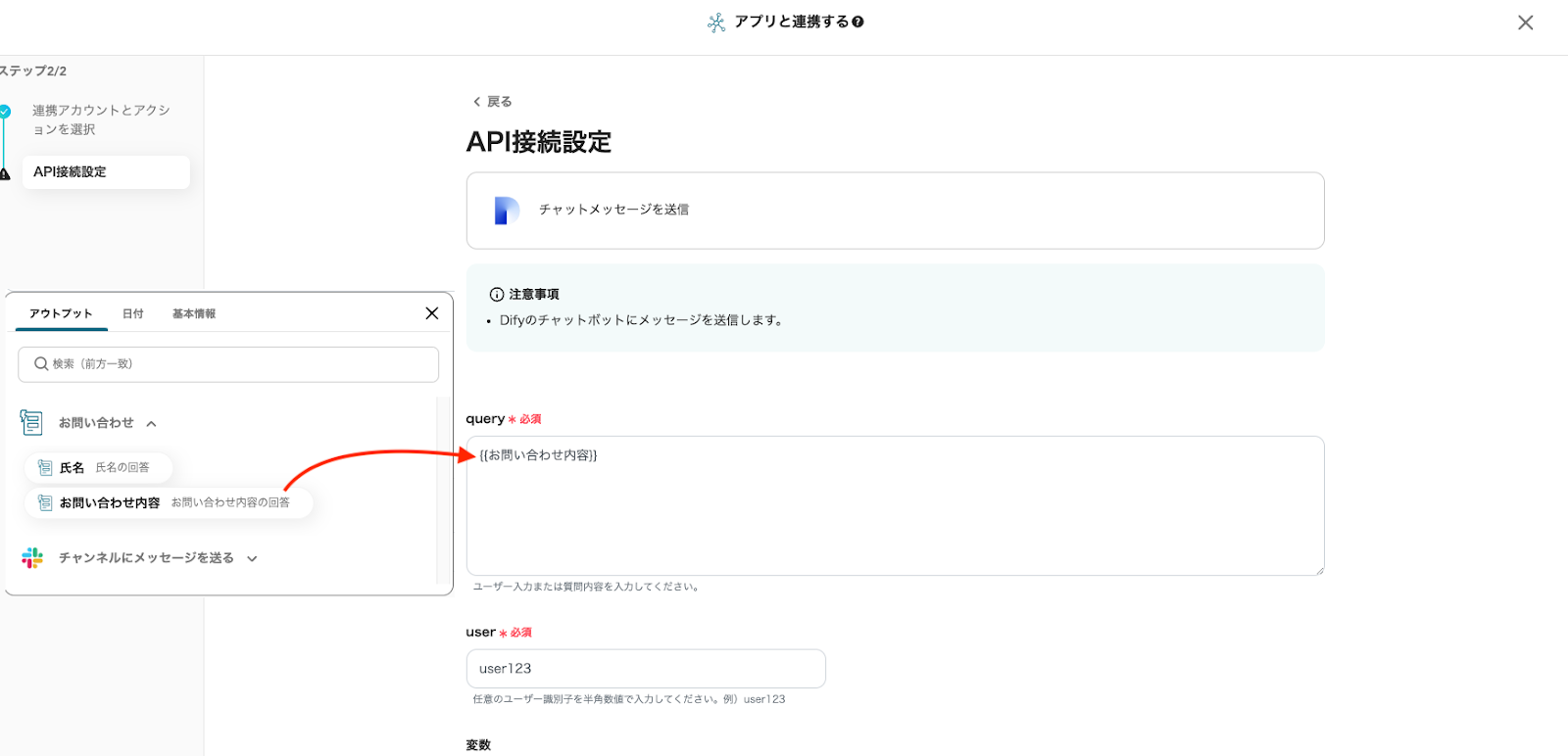 「メッセージ」は任意で設定できます。今回は「お問い合わせがありました」というメッセージと共に、お問い合わせ内容とDifyによる回答内容を含むメッセージを記載しまた。