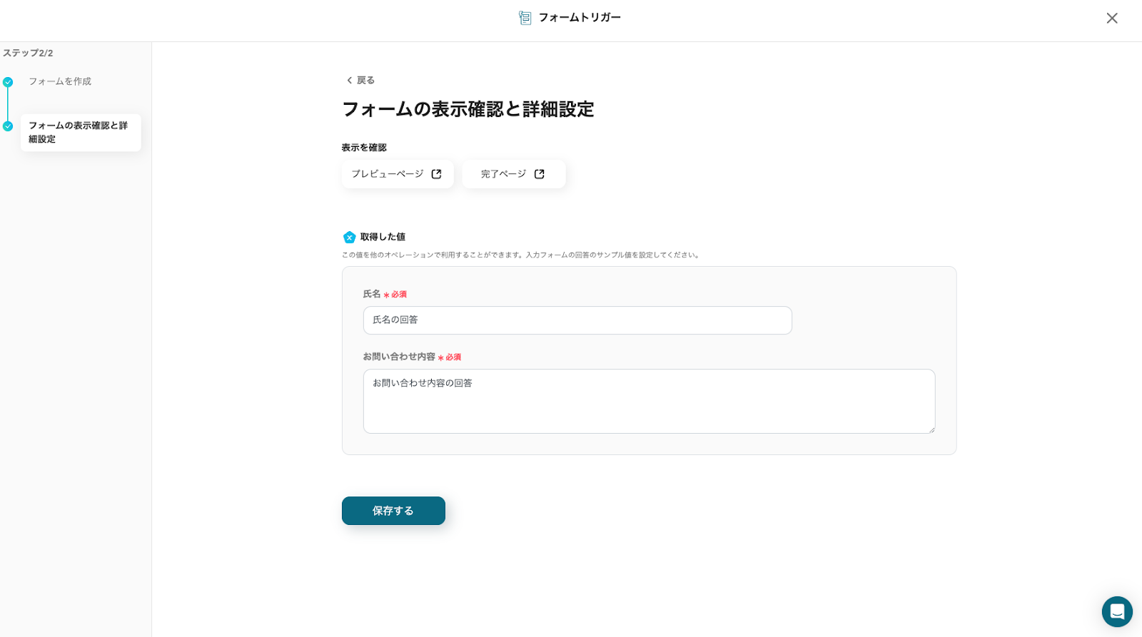 ページ上部のボタンから、作成した「プレビューページ」と「完了ページ」のサンプルが確認できます。